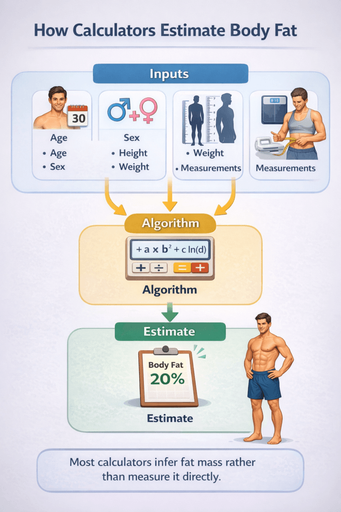 Most online and app-based tools do not measure fat directly. They infer it using statistical models built on population data. Common inputs include: