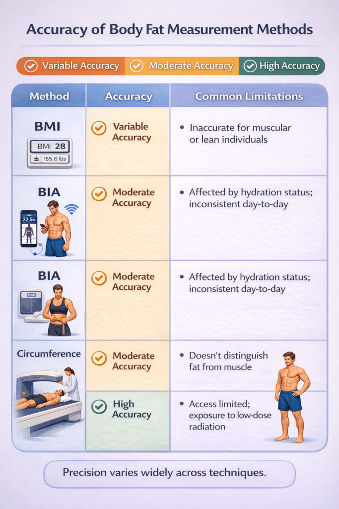 For most people, waist circumference and strength-to-weight progress are often more informative than precise fat percentages.